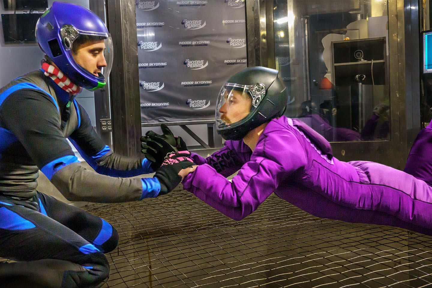Indoor skydiving, as we’ve mentioned, is a sport. That said: Your likelihood of getting injured as a new flyer is super-minimal. As your skills evolve over time, they become about the same as tripping on a long hike, getting spit off the back end of a treadmill or catching an elbow on the basketball court.