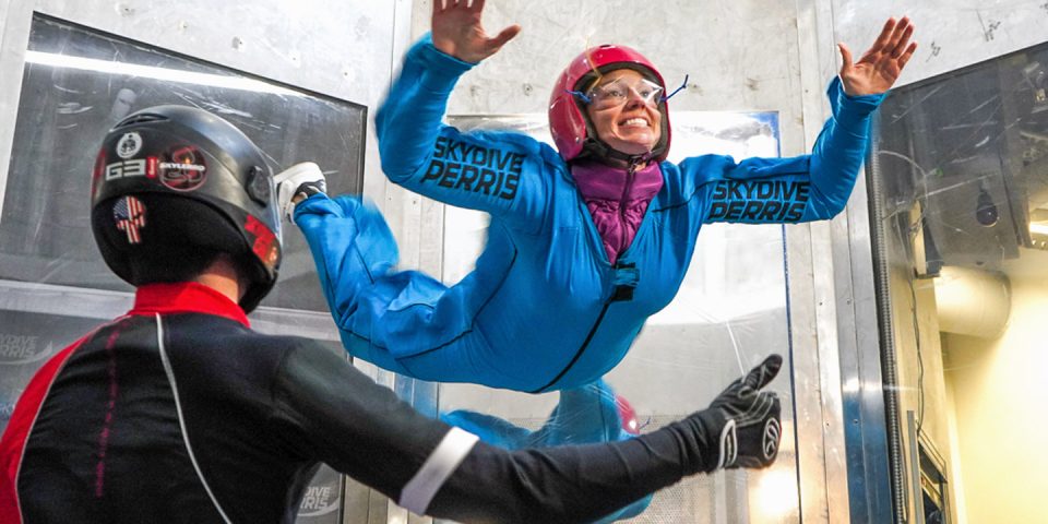 Make 3 one-minute flights in our on-site indoor wind tunnel, each equivalent to skydiving from 14,000 feet MSL! Includes training, gear, instructor support, and flight certificate.