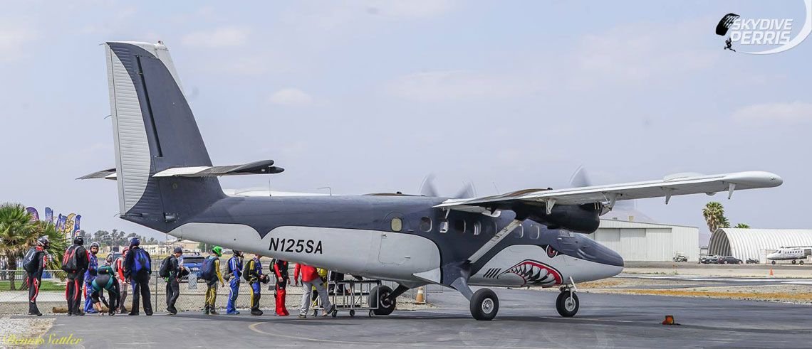 Though the allure of the Skyvan is strong, it isn’t the speediest of skydiving airplanes. If you’re looking to maximize the number of jumps you can make in a day, your best bet is to hitch a ride with the next skydiving plane on our list: the Twin Otter. The Twin Otter has quite a bit going for it: a large door for comfortably launching complicated exits, a speedy ride to altitude, and a roomy interior. At Skydive Perris, we currently have 3 Twin Otters. Two of these skydiving airplanes are quite unique. You see, they’ve been painted to look like sharks!