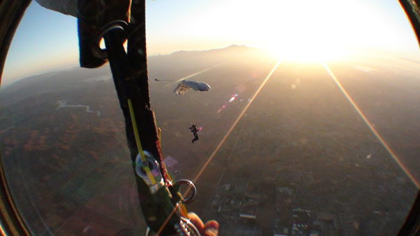 Flying high over Skydive Perris at sunset with Paul Rodriguez and Bart Rogowski.