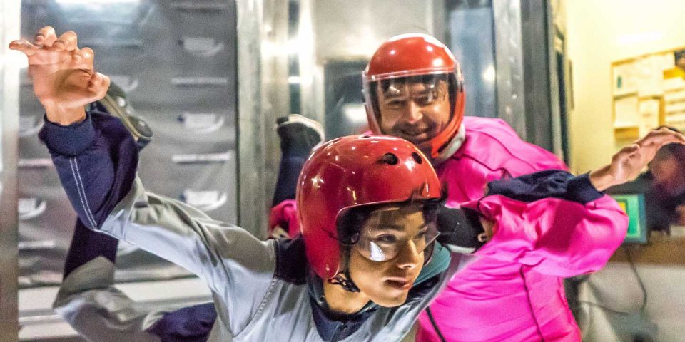2 one-minute indoor skydiving flights per person, accompanied by an instructor
