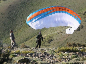 All of the stunt doubles were AFF instructors, and two of them began their 15 second first jump courses with Bunny and Carla. The third double was still up front, so after taking off my favorite hat and throwing it up front, I walked to the door. I put both hands on the ripcord and hopped out poised, to look up at the plane. I was wearing shorts, a t-shirt, and Tevas. I had no altimeter or goggles. I don’t remember pulling, but I remember seeing the Otter flying away as I got opening shock under Jerry Meyers’ ram air pilot rig. I lost the free bag and the ripcord, which he still reminds me of. Bunny and Carla and their instructors got out just after me and they deployed under their rounds right in front of me. I spent the descent just flying around the two rounds so that we stayed together. We were way out over the open desert by now. I was able to tell which way the wind was blowing, and I turned into the wind and landed the square standing up.