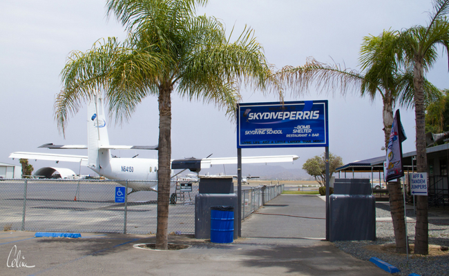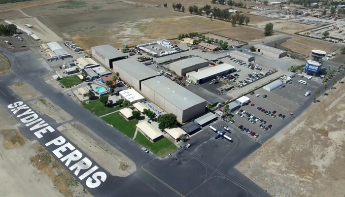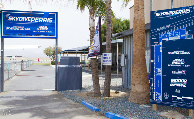 Aerial view of Skydive Perris facilitiesEntrance to Perris Skydiving SchoolSignage at entrance