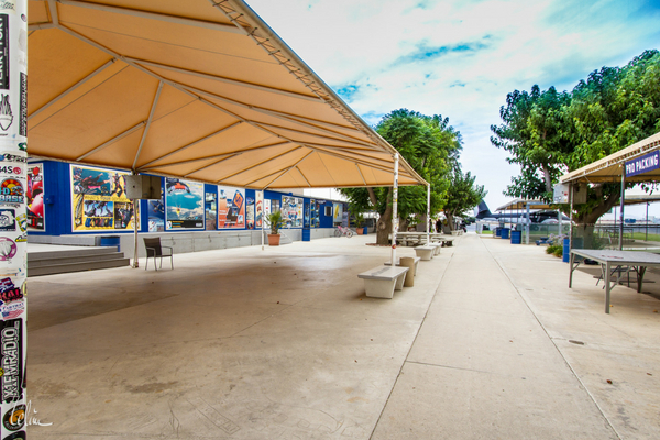 You’ll access Skydive Perris from Goetz Road. When you make the turn into the parking lot at the Skydive Perris sign, don’t stop immediately unless you’re keen for a long, sunny walk; you still have quite a bit of parking lot to cover. Our parking lot is long and skinny, and our on-campus vertical wind tunnel is smack-dab in the middle of it. Unless there’s an event on and the lot is chock-full, you should keep driving and park somewhere near the end.