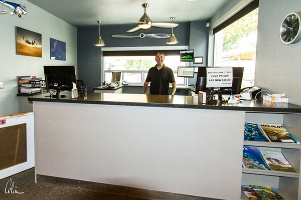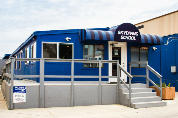 You’ll see the big, blue “Skydiving School” awning on that building. The check-in office is up the stairs. If you have a physical issue with stairs, just ask any of the pro skydivers in the downstairs atrium for help. They’ll be glad to connect you with the office staff.